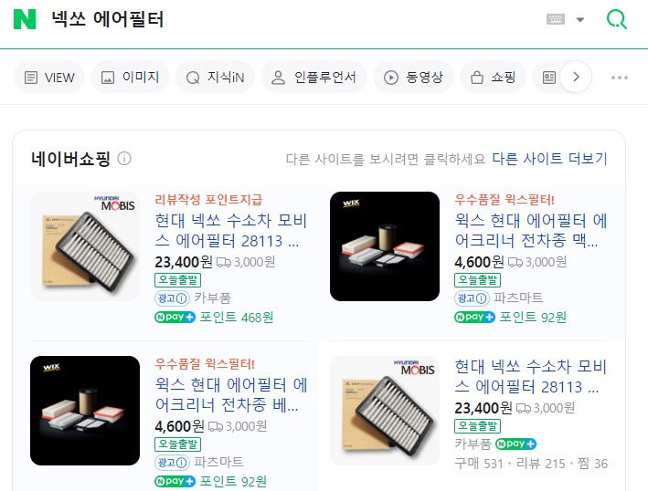 일단 네이버에 " 넥쏘 에어필터 " 검색해줍니다.