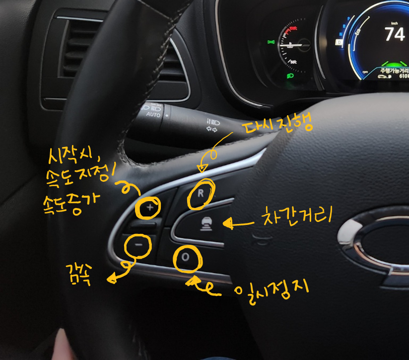 기본적으로 핸들의 버튼으로 조작은 가능하지만, 어댑티브 크루즈 컨트롤 모드를 켜고 끄는 것을 할 수가 없었습니다.